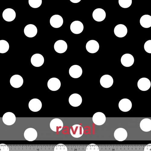 Tela de punto. Tejido de uso habitual para faldas de ensayo. Suave, con mucha caída. Estampado de lunares de 3,50 cms.