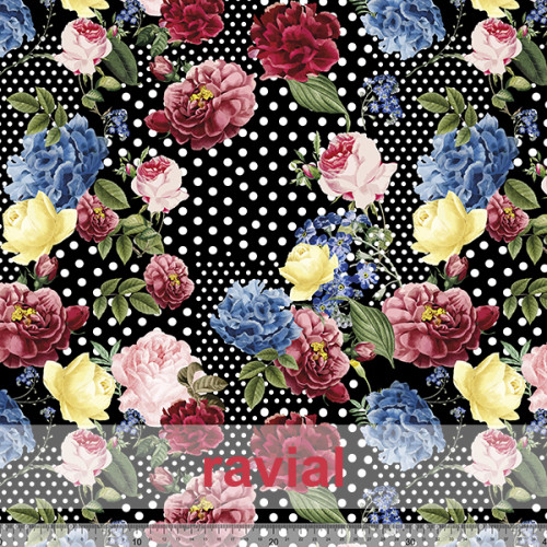 Tela de punto. Tejido de uso habitual para faldas de ensayo. Suave, con mucha caída. Estampado de flores y lunares pequeños (entre 0,40 y 0,80 cms.)