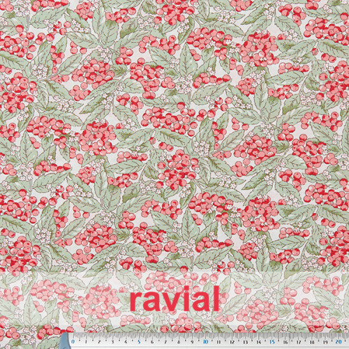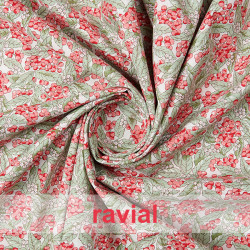 Tissu popeline de coton doux avec imprimé de petites fleurs, feuilles et fruits.