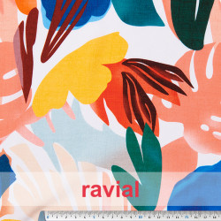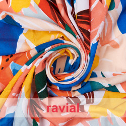 Viscose. Tissu doux imprimé très fluide. Imprimé feuilles.