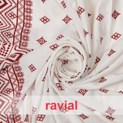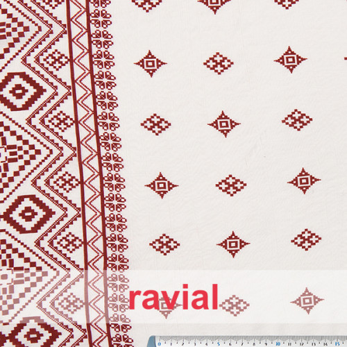 Tissu froissé à motifs géométriques avec bordure.